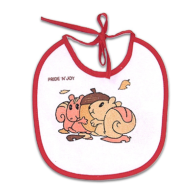 Description: Tie back towelling bib with contrasting color border and attractive print.